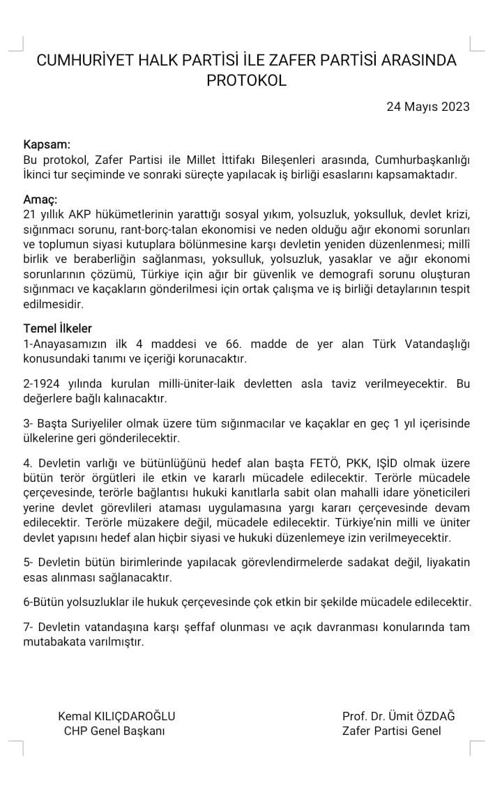 Cumhuriyet Halk Partisi ile Zafer Partisi arasında protokol imzalandı.