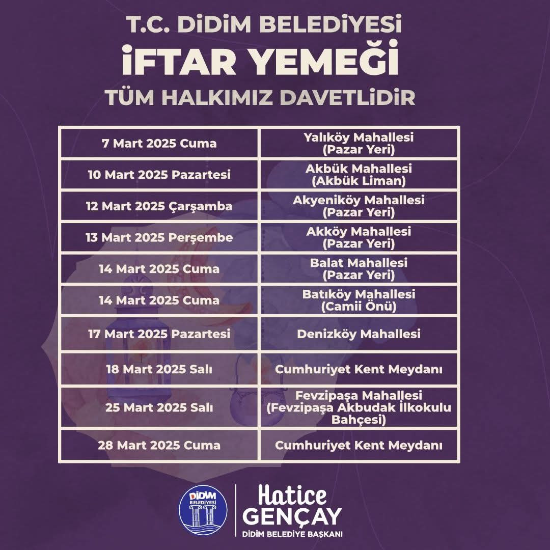 Cumhuriyet Kent Meydanı’nda gerçekleştirilen iftar yemeğine Didim Belediye Başkanı Hatice Gençay, CHP Didim İlçe Başkanı Aşkın Atlı, CHP Didim Kadın Kolları Başkanı Gülcan Doğan Bozkurt, Belediye Başkan Yardımcıları Aydan Aşık Turgut, Kaan Topçuoğulları ile Engin Topal, Belediye Meclis üyeleri ve Didimli vatandaşlar katıldı.