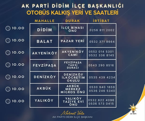 AK Parti Didim İlçe Başkanlığından açıklama: Kıymetli Hemşerilerimiz; Cumhurbaşkanımız ve Genel Başkanımız Sayın Recep Tayyip Erdoğan’ın 24 Ocak Cumartesi günü Aydın Atatürk Kent Meydanı’nda gerçekleştirileceği büyük mitingimiz için Didim İlçe Başkanlığımız tarafından mitinge katılım için İlçe teşkilatımızdan otobüsler saat 10:00’ da kaldırılacaktır. Mahallelerimizden kalkacak otobüslerin saat ve konum bilgisi görselde belirtilen şekildedir. Gerekli durumlarda iletişim için de irtibat numaraları bulunmaktadır. Katılımlarınız bizler için çok kıymetli olacaktır. Şimdiden teşekkür eder, hayırlı günler dileriz.