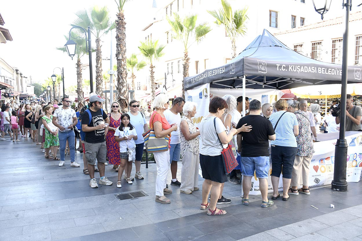 Kuşadası’nda 3 gün boyunca lezzet, müzik, sanat ve eğlenceyi birleştiren Kuşadası Sokak Festivali, 6 Şubat’ta meydana gelen depremden etkilenen 11 ilden getirilen malzemelerle 5 tonluk kazanda pişirilen 15 bin kişilik aşure ikramı ile sona erdi. Türkiye’nin farklı kentlerinden gelen 60 aşçı tarafından 39 çeşit ürünün birleşiminden yapılan aşure dev kazanda kaynatılarak yaklaşık 12 saat içinde hazır hale getirildi. Akşam saatlerinde vatandaşlara dağıtımı yapılan aşure büyük ilgi gördü.
