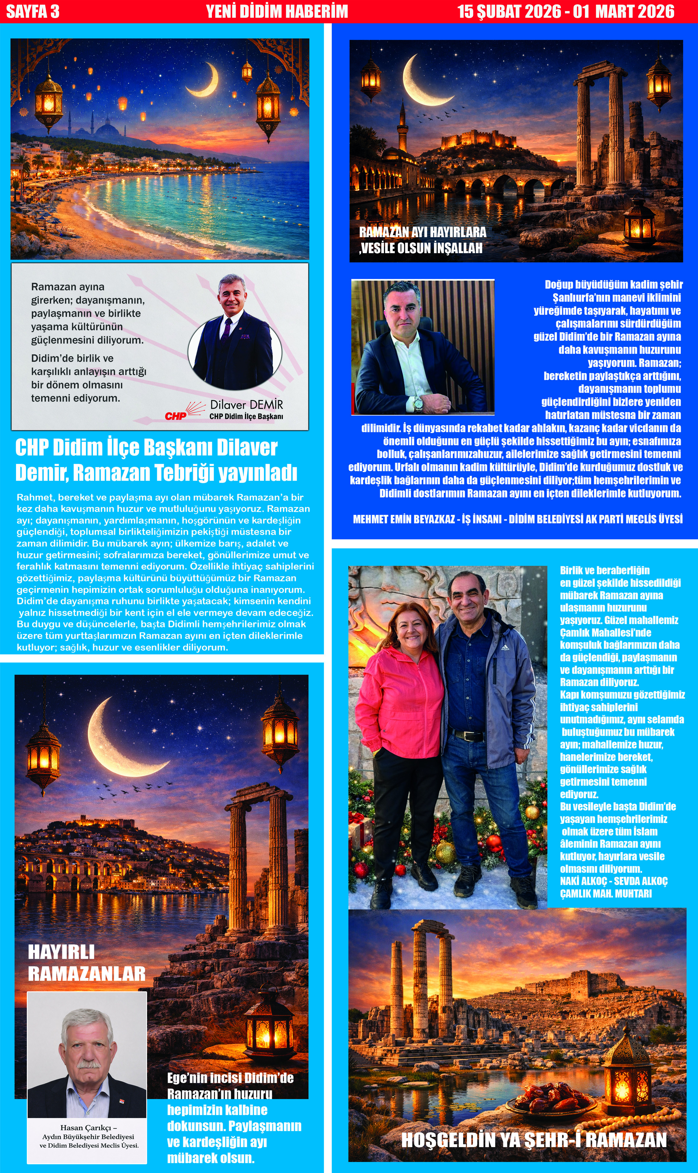 Yeni Didim Haberim Gazetesi Ramazan Özel Sayısı tamamen renkli 12 sayfa olarak çıktı, bugün dağıtılıyor. 13.30'da Didim Belediyesi girişinden alabilirsiniz.
