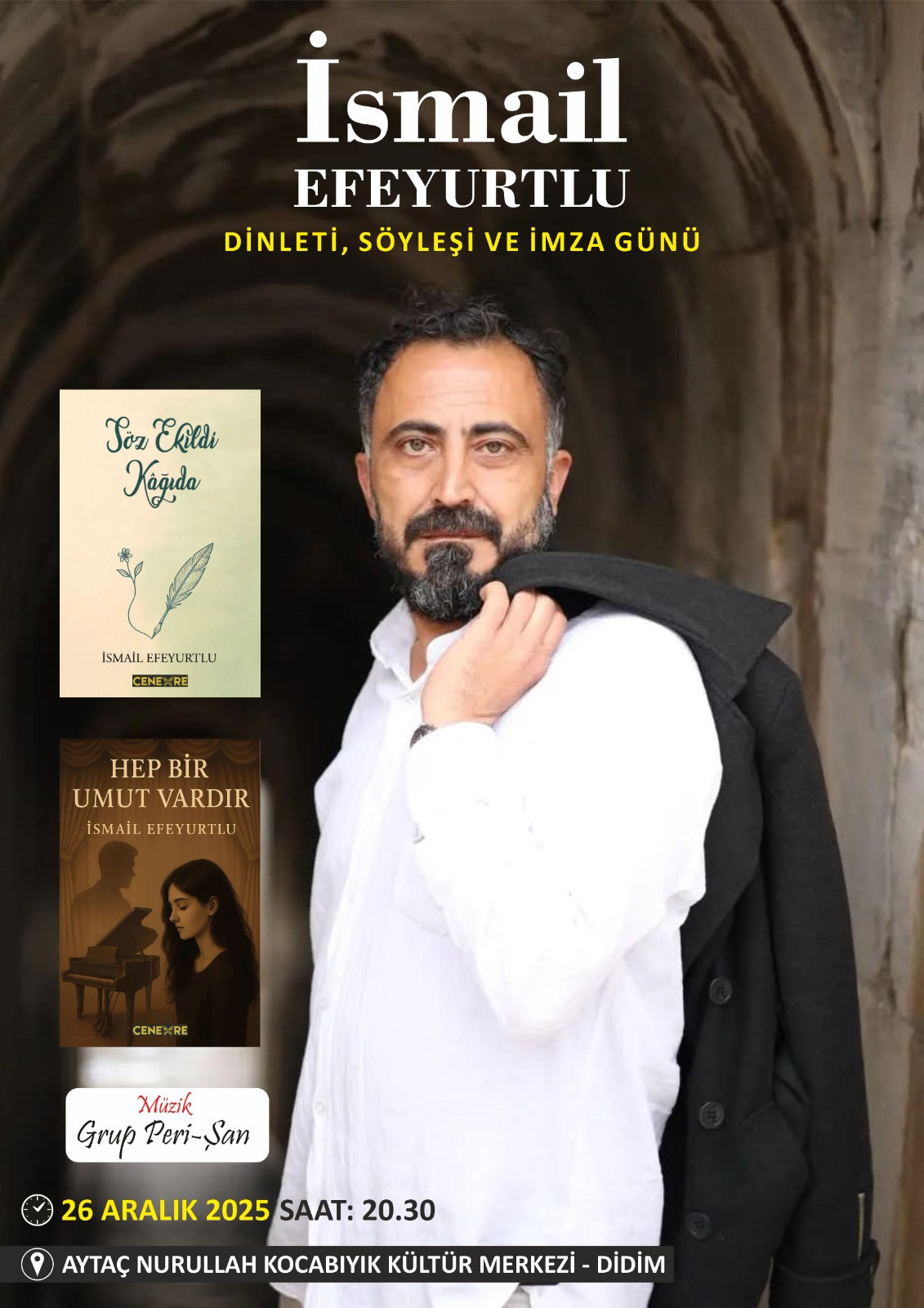 Dün akşam (26.12.2025), eşim Zekiye Sarışın, aile dostumuz Cahit Aksoy, Balıkçı Ustam işletmecisi Hüseyin Özkan, Didim Kent Konseyi Başkanı Osman Ayyıldız, iş insanı Caner Ünlü, Bedri Altıtaş, Gazeteci Arif Çolak, Gazeteci Ergun KOrkmaz ve Didim Ticaret Odası Genel Sekreteri Murat Güneş ile birlikte, Nurullah Kocabıyık Kültür Merkezi'mde sergilediği keyifli ve güçlü performansında İsmail Efeyurtlu Dinletisi'ni izleme ve imza gecesine katılma fırsatı bulduk. Aynı zamanda kitaplarını imzalattık.