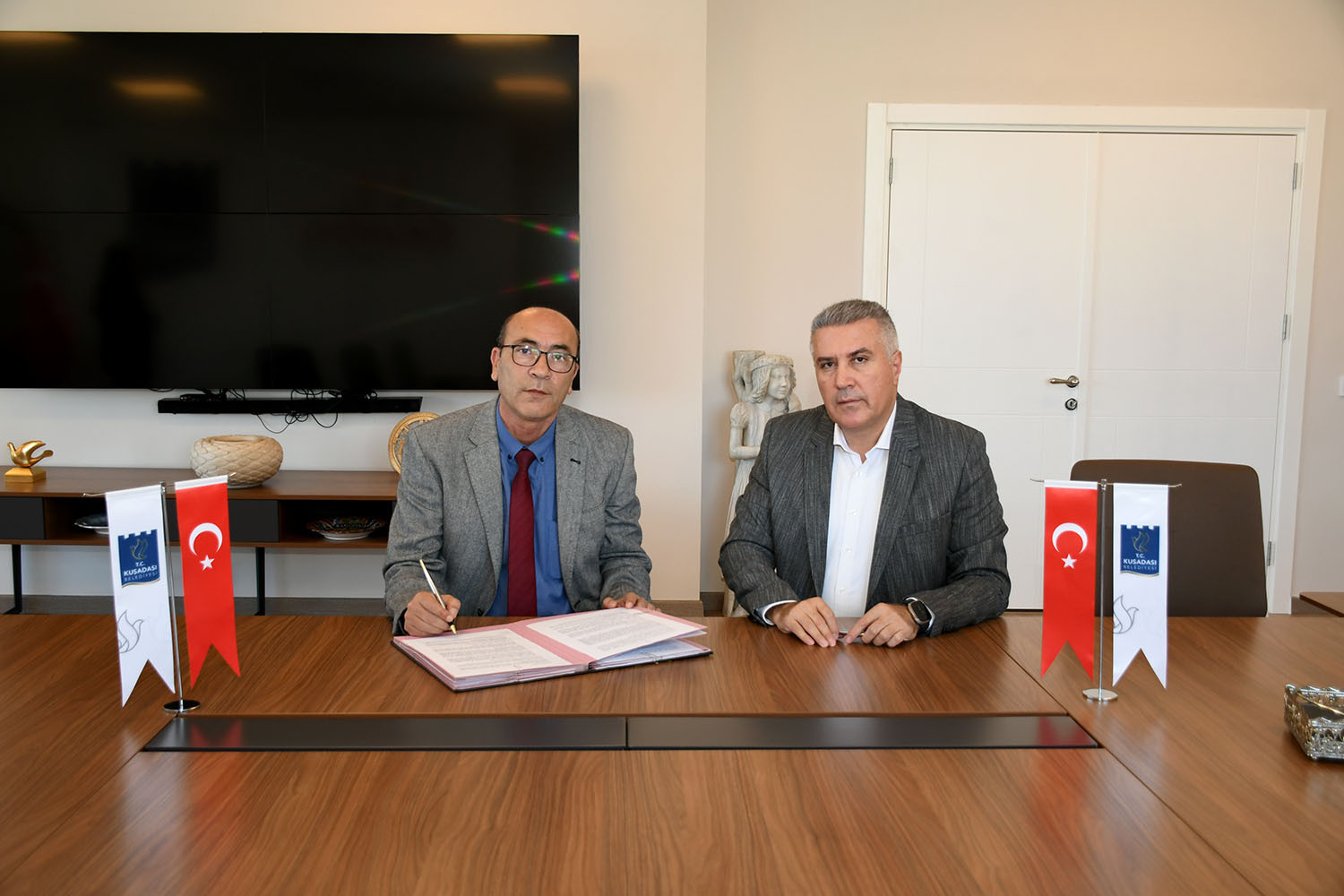 Belediye Başkanlık makamında gerçekleşen protokolde Kuşadası Belediye Başkan Vekili Oğuzhan Turan ile Aydın Arkeoloji Müzesi Müdürü Ali Atmaca ortak hizmet protokolüne imza attı.