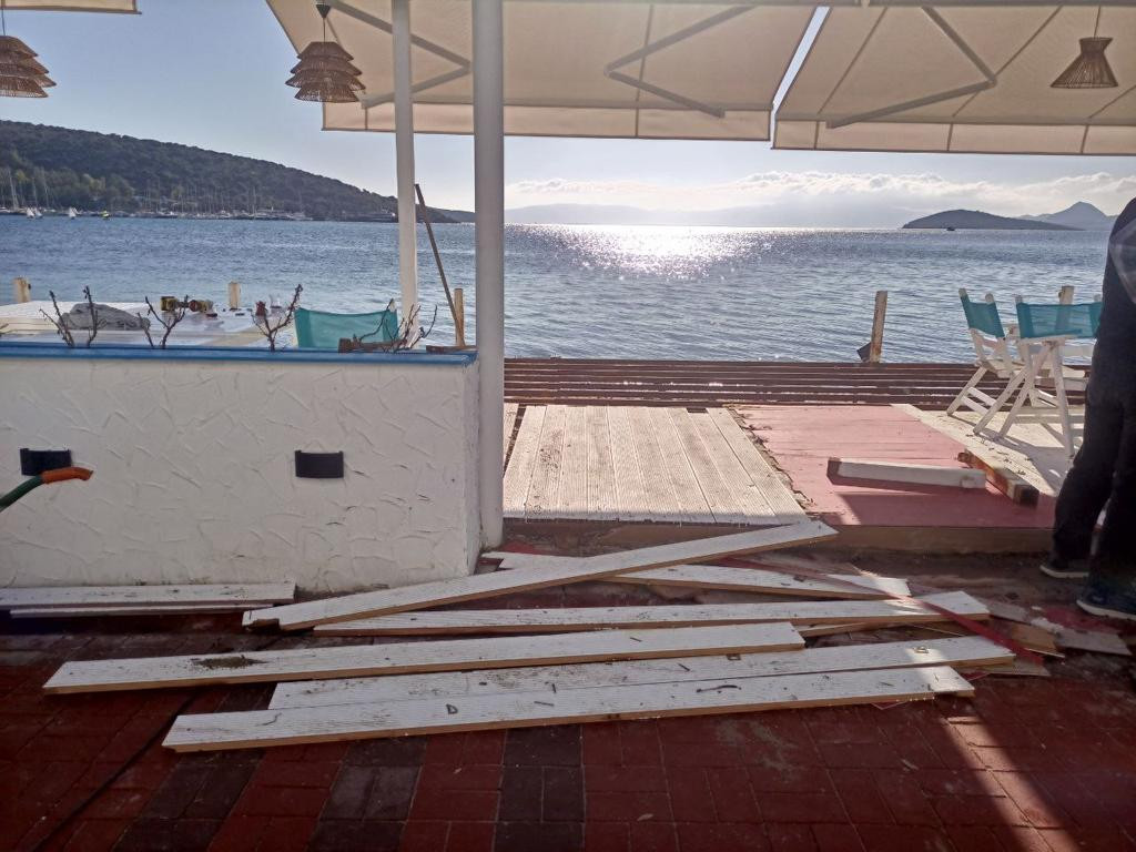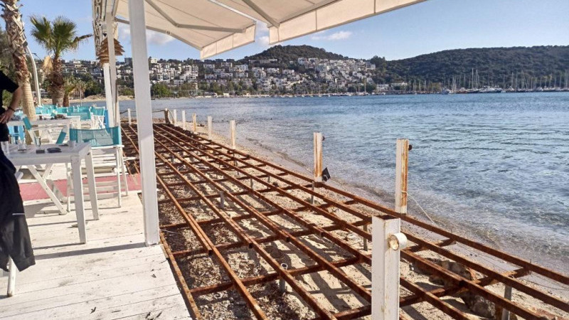 Belediye ekiplerinin müdahalesi sonucu, Bitez sahilde kıyı işgaline sebep olan ahşap platform sökülüyor