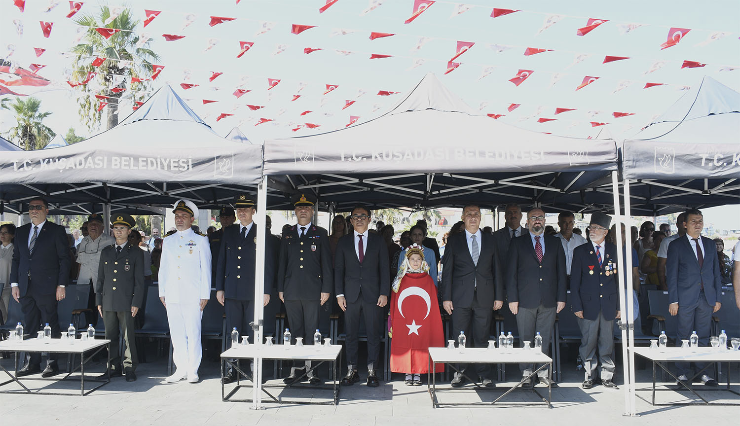 Atatürk Meydanı'nda düzenlenen resmi törenle devam eden kutlamalara Kuşadası Kaymakam Vekili Ümit Hüseyin Güney, Kuşadası Belediye Başkan Vekili Tibet Özer, Kuşadası Cumhuriyet Başsavcısı Cem Koray Eryılmaz, Kuşadası İlçe Emniyet Müdür Vekili Rasim Demirelli, İlçe Jandarma Komutan Vekili Üsteğmen Fatih Fuçular, Kuşadası Sahil Güvenlik Karakol Komutanı Binbaşı Özgür Lafçı, siyasi parti ve sivil toplum kuruluşlarının temsilcileri ile vatandaşlar katıldı.