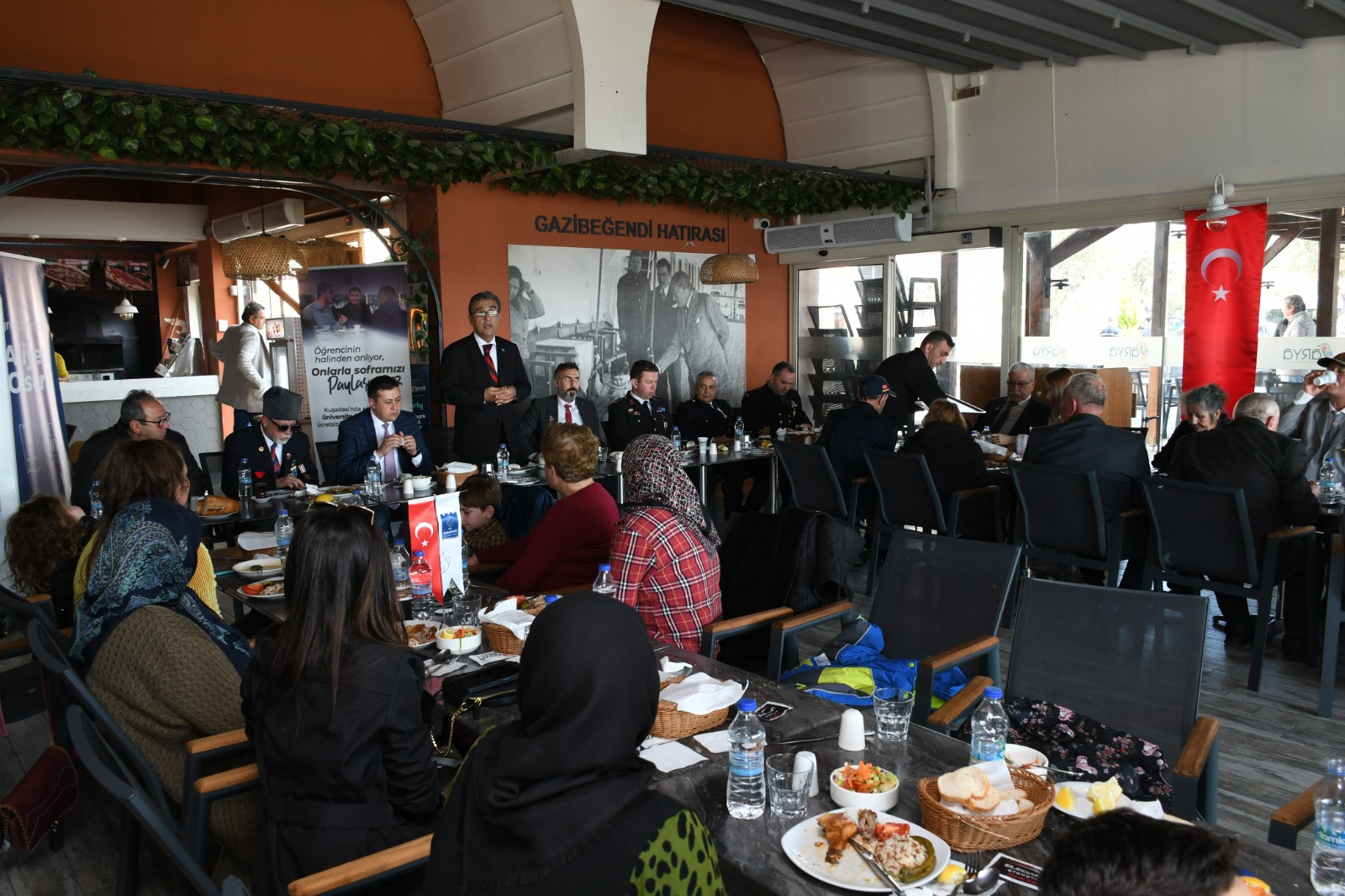 Kuşadası Belediyesi’nin Gazibeğendi Tesisleri’nde verilen öğle yemeğine Kuşadası Kaymakamı Sadettin Yücel, Kuşadası Belediye Başkan Yardımcısı Özgür Batçıoğlu, Kuşadası Cumhuriyet Başsavcısı Cem Koray Eryılmaz, İlçe Emniyet Müdür Mehmet Ali Berksoy, Türkiye Muharip Gaziler Derneği Kuşadası Şubesi üyeleri, ilçede görev yapan idari ve mülki amirler ile şehit aileleri, yakınları ve gaziler katıldı. Yemek programında konuşan Kuşadası Kaymakamı Sadettin Yücel, “Öncelikle Türkiye Cumhuriyeti’nin kurucusu Gazi Mustafa Kemal Atatürk başta olmak üzere bütün aziz şehitlerimizi saygı ve minnetle anıyor, onlara Allah’tan rahmet diliyorum. Sizler şehit ailesi olma şerefine ulaşmış, milletimizin kalbinde müstesna bir yere sahipsiniz. Bu anlamda, şehit aileleri bizim baş tacımızdır. Şehitlerimizin bizlere miras bıraktığı mukaddes vatan toprakları üzerinde yaşamanın bilinciyle onların hatıralarına saygı duyuyoruz. Allah bir daha bu millete İstiklal Marşı yazdırmasın” diye konuştu.