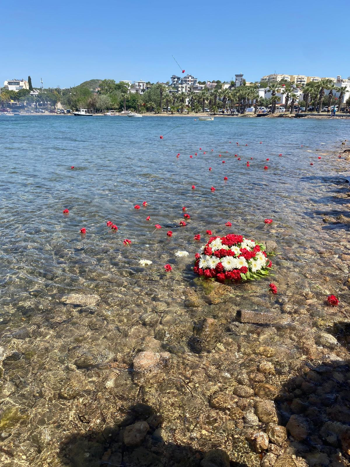 Saatler 14:00’ü gösterdiğinde, çiçekler birer birer denize bırakılıyor.