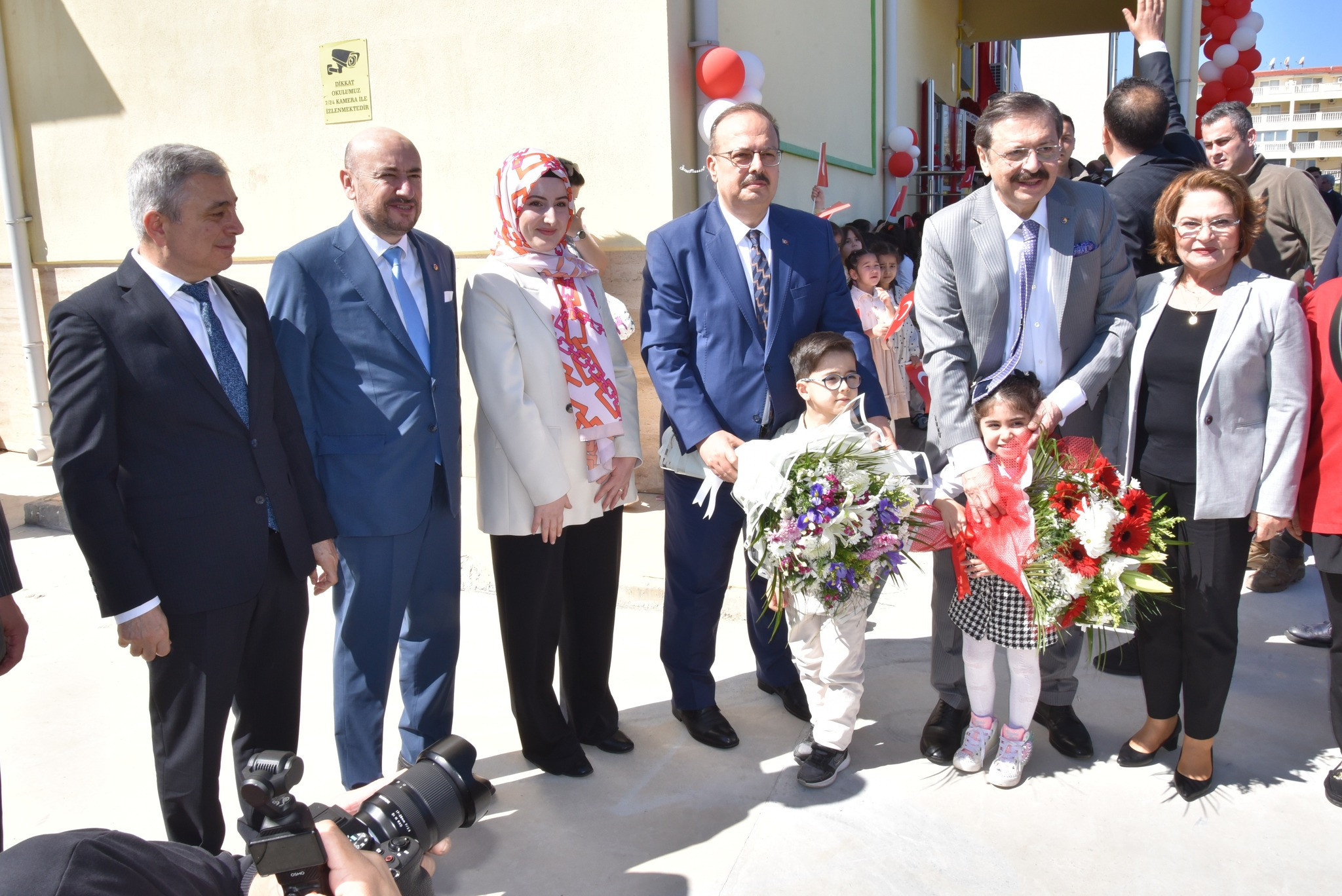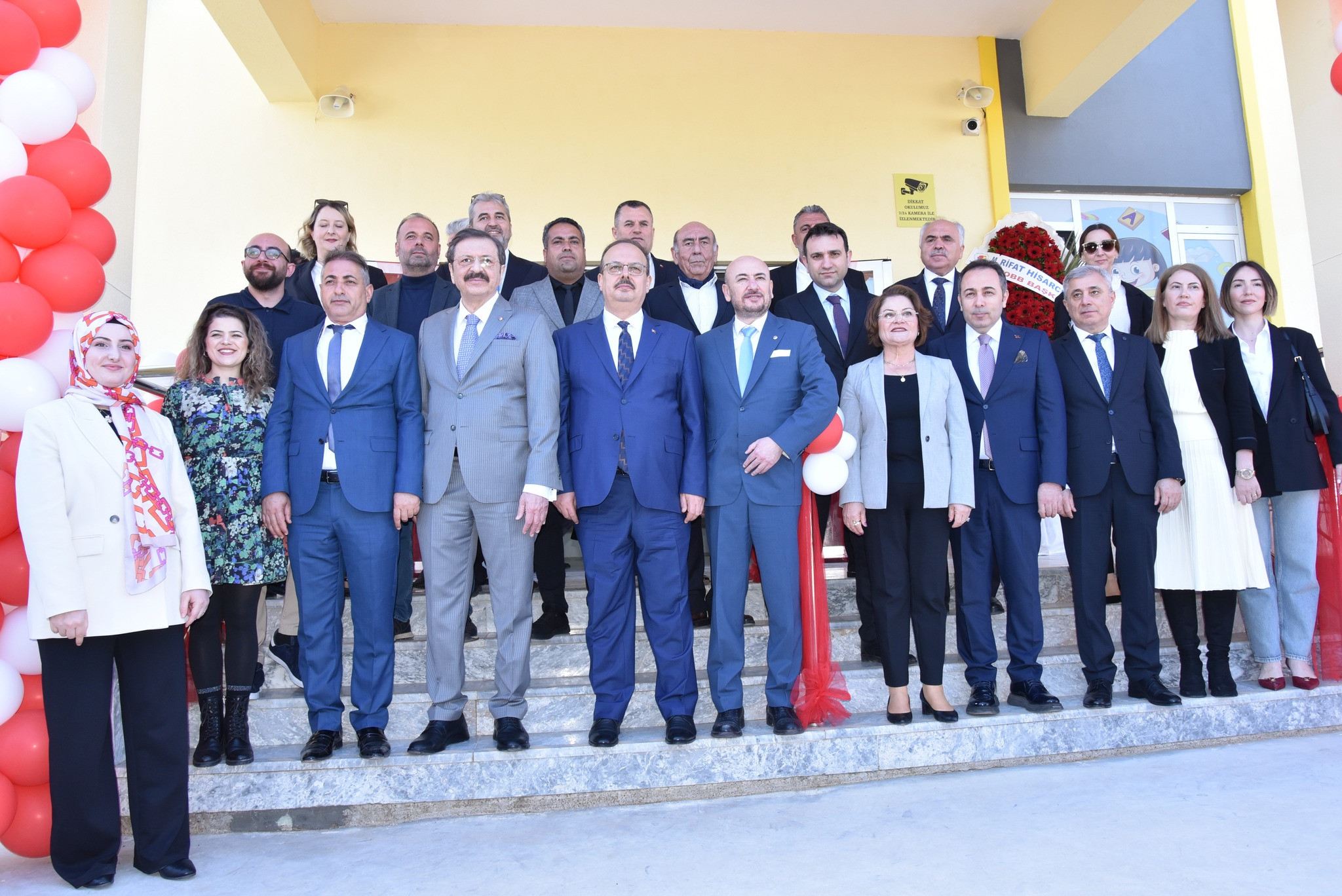 Okul önünde öğrenciler tarafından çiçeklerle ve bayraklarla coşkulu şekilde karşılanan TOBB Başkanı Hisarcıklıoğlu ve Vali Canbolat okul bahçesinde yapılan halk oyunları gösterisini izledi.