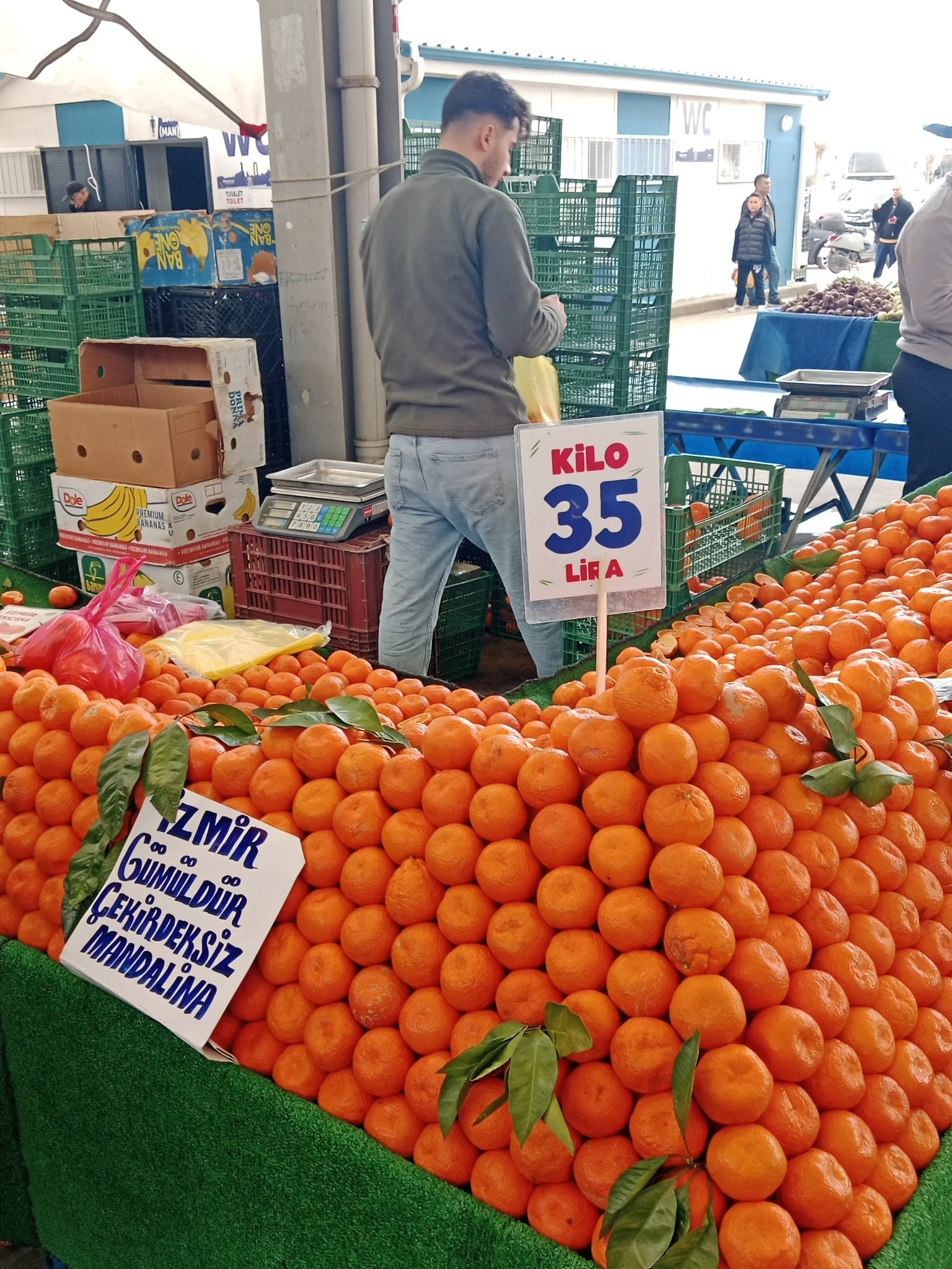 Narenciye tezgâhı… İzmir mandalinası, çekirdeksiz. 35 lira. Portakal 70. Muz 40.