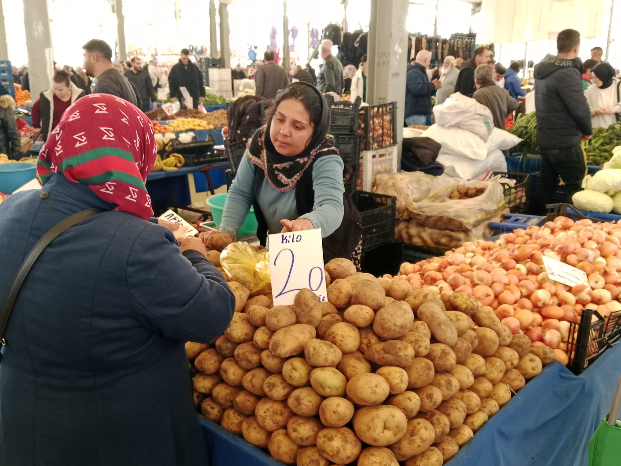 Yan tezgâhta patates var; 20 lira yazıyor ama torbaya girdi mi hesabı büyüyor.